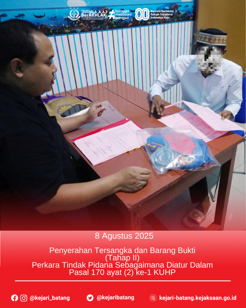 Telah dilaksanakan Penyerahan Tersangka Dan Barang Bukti (Tahap II) Perkara Tindak Pidana sebagaimana diatur dalam Pasal 170 ayat (2) ke-1 KUHP dari Penyidik Polres Batang kepada Jaksa Penuntut Umum Kejaksaan Negeri Batang.