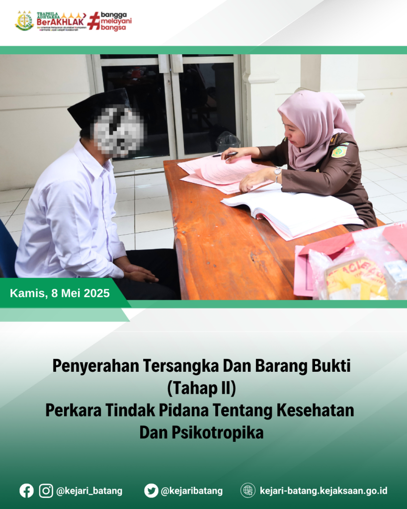 Telah dilaksanakan Penyerahan Tersangka dan Barang Bukti (Tahap II) perkara tindak pidana tentang Kesehatan Dan Psikotropika dari Penyidik Polres Batang kepada Jaksa Penuntut Umum Kejaksaan Negeri Batang, Rizky Ika Pratiwi, S.H., M.H.