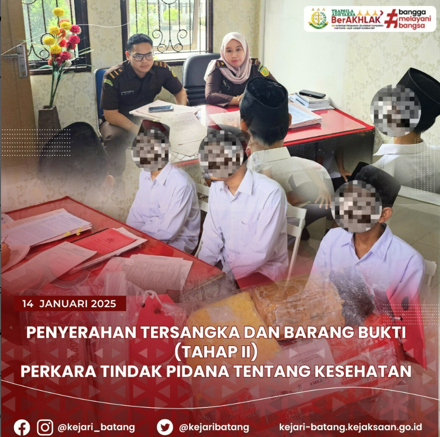 Hari Selasa, 14 Januari 2025 bertempat di Kejaksaan Negeri Batang dilaksanakan Penyerahan Tersangka dan Barang Bukti (Tahap II) perkara tindak pidana tentang Kesehatan dari Penyidik Polres Batang.