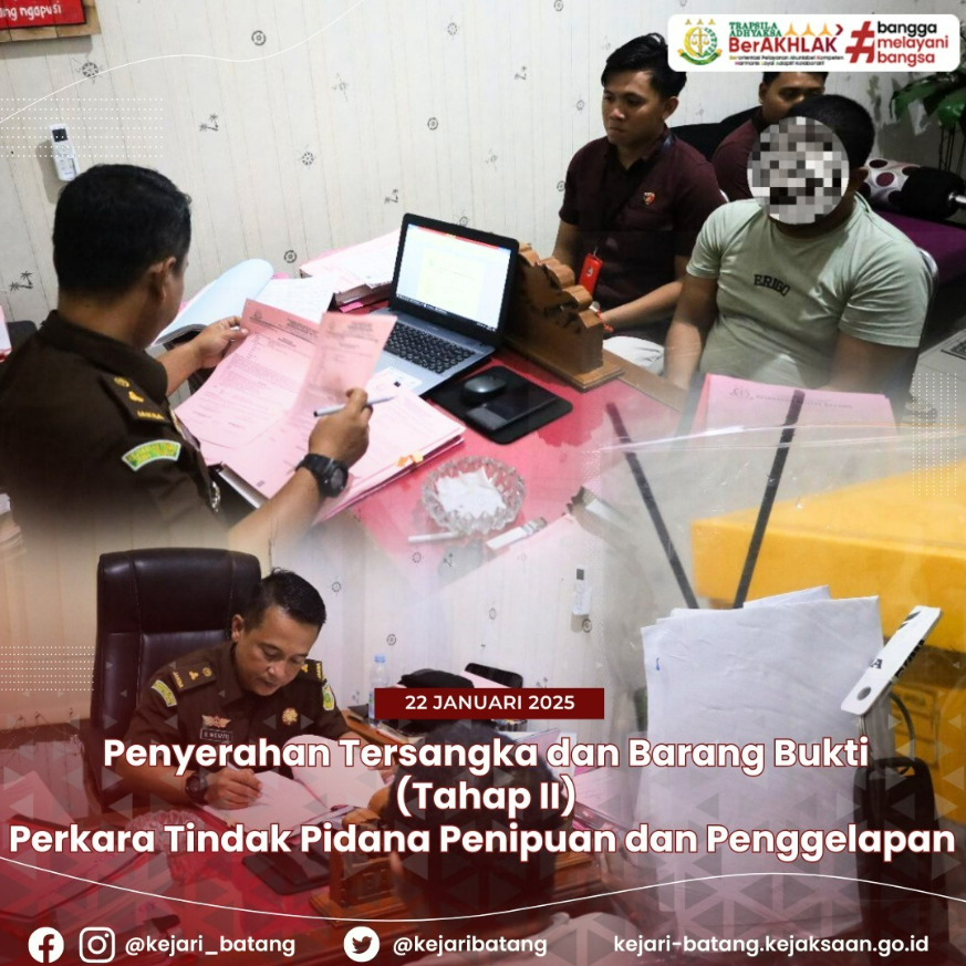Hari Rabu, 22 Januari 2025 bertempat di Kejaksaan Negeri Batang dilaksanakan Penyerahan Tersangka dan Barang Bukti (Tahap II) perkara tindak pidana tentang Penipuan dan Penggelapan dari Penyidik Polres Batang.