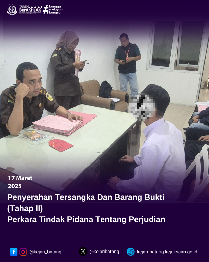 Bahwa pada hari Senin, 17 Maret 2025 bertempat di Kejaksaan Negeri Batang telah berlangsung Penyerahan Tersangka dan Barang Bukti (Tahap II) Perkara Tindak Pidana Tentang Perjudian dari Polres Batang.