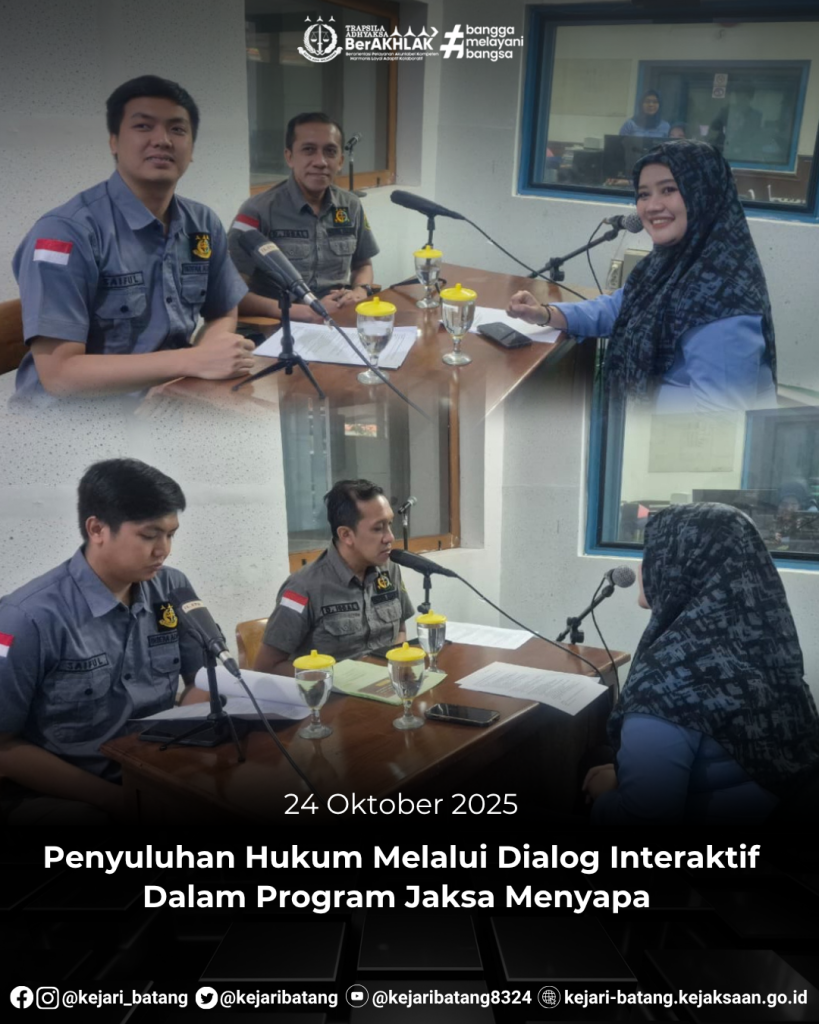 Pada hari Jumat tanggal 24 Oktober 2025, bertempat di RRI Pro 1 Semarang, Kepala Seksi Intelijen Kejaksaan Negeri Batang, Dipo Iqbal, S.H., bersama Kasubsi II Seksi Intelijen Kejaksaan Negeri Batang, Muhammad Saiful Tsani, S.H., M.H., telah melaksanakan kegiatan Penyuluhan Hukum melalui siaran dialog interaktif dalam Program “Jaksa Menyapa”.