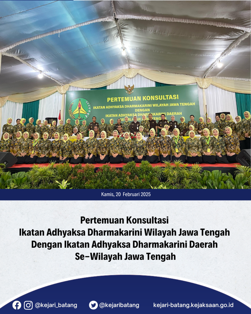 Bahwa pada hari Kamis, 20 Februari 2025 telah dilaksanakan Pertemuan Konsultasi Ikatan Adhyaksa Dharmakarini Wilayah Jawa Tengah dengan Ikatan Adhyaksa Dharmakarini Daerah Se-Wilayah Jawa Tengah.