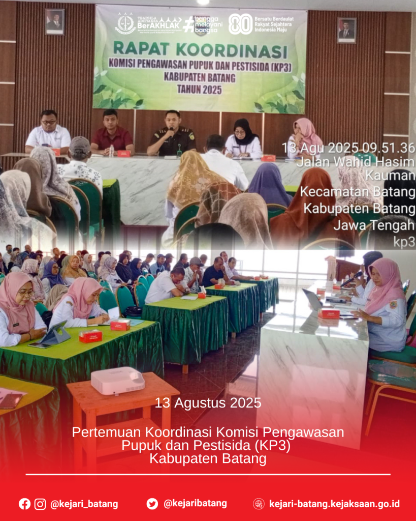 Pada hari Rabu, 13 Agustus 2025, bertempat di Aula Lantai 3 Dinas Pangan dan Pertanian Kabupaten Batang, Kepala Kepala Kejaksaan Negeri Batang diwakili oleh Staff Intelijen menghadiri Pertemuan Koordinasi Komisi Pengawasan Pupuk dan Pestisida (KP3) Kabupaten Batang