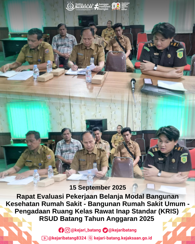 Pada hari Senin tanggal 15 September 2025, bertempat di ruang rapat RSUD Batang, Jaksa Pengacara Negara Kejaksaan Negeri Batang menghadiri Rapat Evaluasi Pekerjaan Belanja Modal Bangunan Kesehatan Rumah Sakit – Bangunan Rumah Sakit Umum – Pengadaan Ruang Kelas Rawat Inap Standar (KRIS) RSUD Batang Tahun Anggaran 2025.