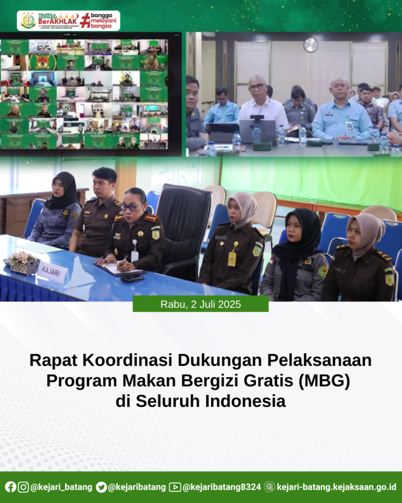 Pada hari Rabu, 2 Juli 2025, bertempat di Aula Kejaksaan Negeri Batang, Kepala Kejaksaan Negeri Batang, Dr. Efi Paulin Numberi,S.H.,M.H. beserta Kasubsi II Seksi Intelijen dan Staff Intelijen Kejaksaan Negeri Batang telah mengikuti Zoom Meeting Undangan Rapat Koordinasi Dukungan Pelaksanaan Program Makan Bergizi Gratis (MBG) di Seluruh Indonesia.