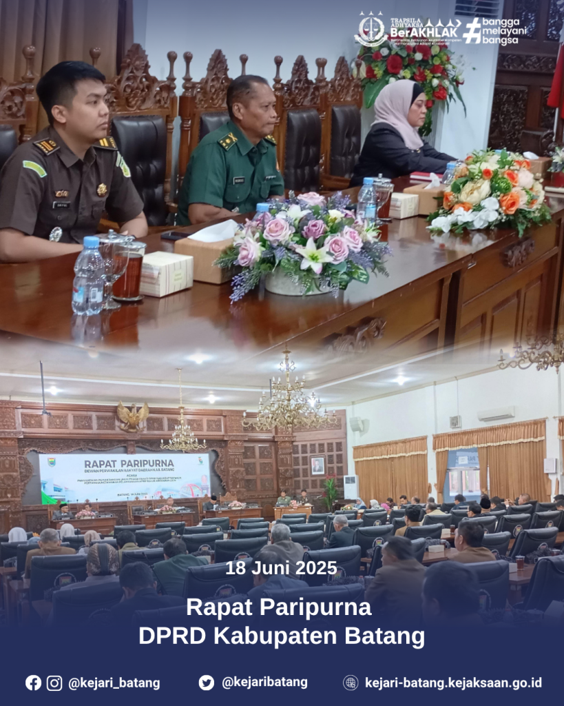 Rabu, 18 Juni 2025 bertempat di Gedung DPRD Kabupaten Batang, Kasubsi II Seksi Intelijen Kejaksaan Negeri Batang, Muhammad Saiful Tsani ,S.H., M.H. telah mengikuti Kegiatan Rapat Paripurna DPRD Kabupaten Batang dalam acara “Penyampaian Pemandangan Umum Fraksi-Fraksi DPRD terhadap Raperda tentang Pertanggungjawaban Pelaksanaan APBD Tahun Anggaran 2025”.