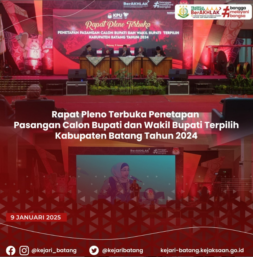 Bahwa pada hari pada hari Kamis, 09 Januari 2025 Pukul 10.00 s.d 12.30 WIB di Ballroom Hotel Dewi Ratih Kabupaten Batang telah dilaksanakan Rapat Pleno Terbuka Penetapan Pasangan Calon Bupati dan Wakil Bupati Terpilih Kabupaten Batang Tahun 2024.