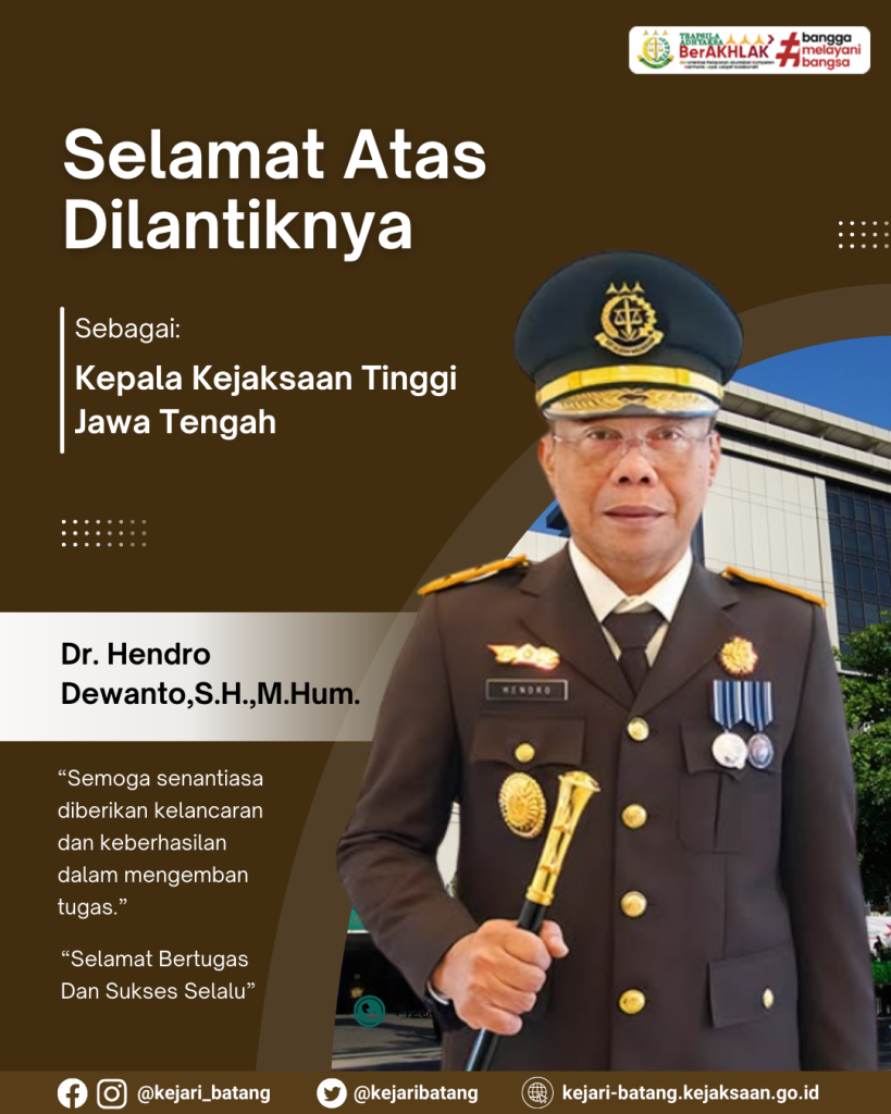 Selamat atas dilantiknya sebagai Kepala Kejaksaan Tinggi Jawa Tengah, Bapak Dr. Hendro Dewanto, S.H.,M.Hum.