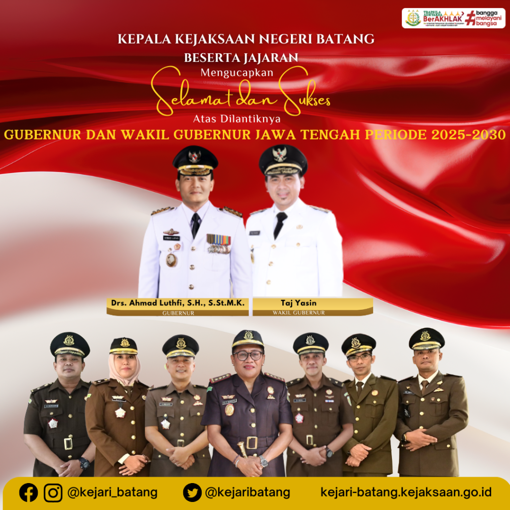 Kepala Kejaksaan Negeri Batang beserta Jajaran mengucapkan Selamat dan Sukses atas dilantiknya Gubernur dan Wakil Gubernur Jawa Tengah, Drs. Ahmad Luthfi, S.H., S.St.M.k. dan Taj Yasin, Periode 2025-2030.