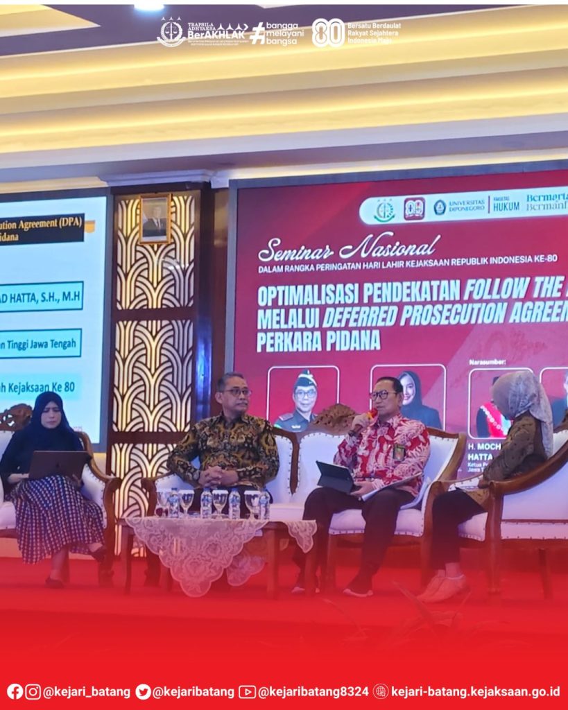Pada hari Kamis, 28 Agustus 2025, bertempat di Hall Gedung PKM Lantai 3, Gedung Prof. Purwahid Patrik, S.H, Kampus Undip Semarang dalam rangka memperingati Hari Lahir Kejaksaan Republik Indonesia ke-80 Tahun 2025, Kejaksaan Tinggi Jawa Tengah menyelenggarakan Seminar dengan tema “Optimalisasi Pendekatan Follow The Asset dan Follow The Money Melalui Deferred Prosecution Agreement dalam Penanganan Perkara Pidana”, dihadiri secara langsung oleh Kepala Kejaksaan Negeri Batang, Dr. Raymond Ali, S.H., M.H. bersama Kepala Seksi Tindak Pidana Umum dan Kepala Seksi Tindak Pidana Khusus, sedangkan secara daring bertempat di Aula Kejaksaan Negeri Batang di ikuti seluruh Kasubsi dan Jaksa Fungsional pada Kejaksaan Negeri Batang.