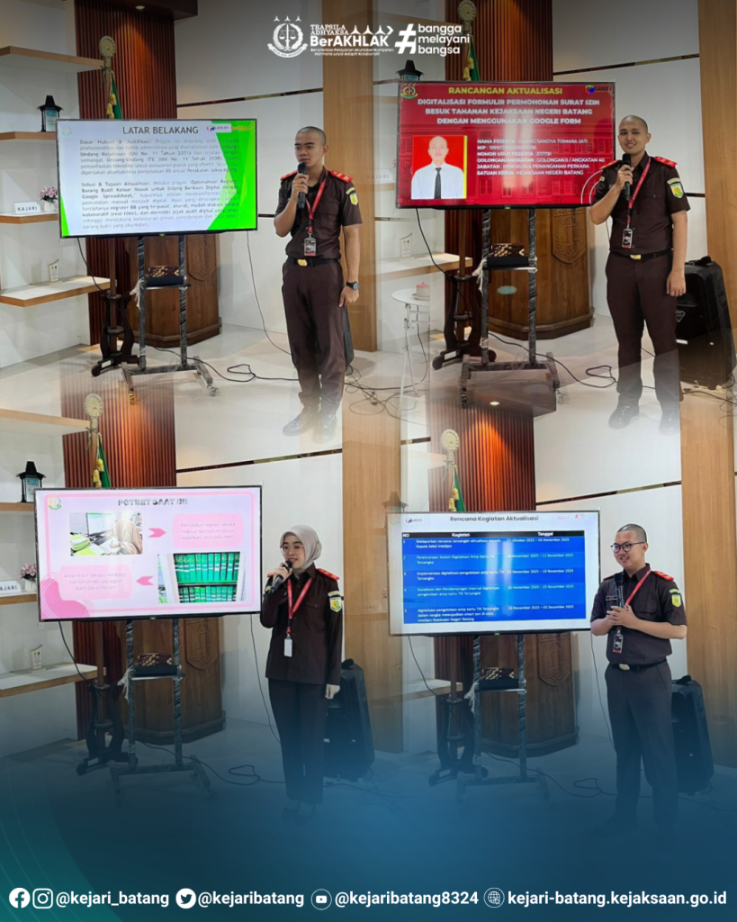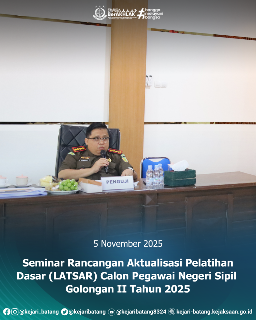Pada hari Rabu tanggal 5 November 2025, bertempat di Aula Kejaksaan Negeri Batang telah dilaksanakan kegiatan Seminar Rancangan Aktualisasi Pelatihan Dasar (Latsar) Calon Pegawai Negeri Sipil Golongan II Tahun 2025. Kegiatan ini diikuti oleh para peserta Latsar yang tengah menjalani masa pelatihan sebagai bagian dari proses pembentukan karakter dan profesionalisme aparatur sipil negara di lingkungan Kejaksaan Republik Indonesia.