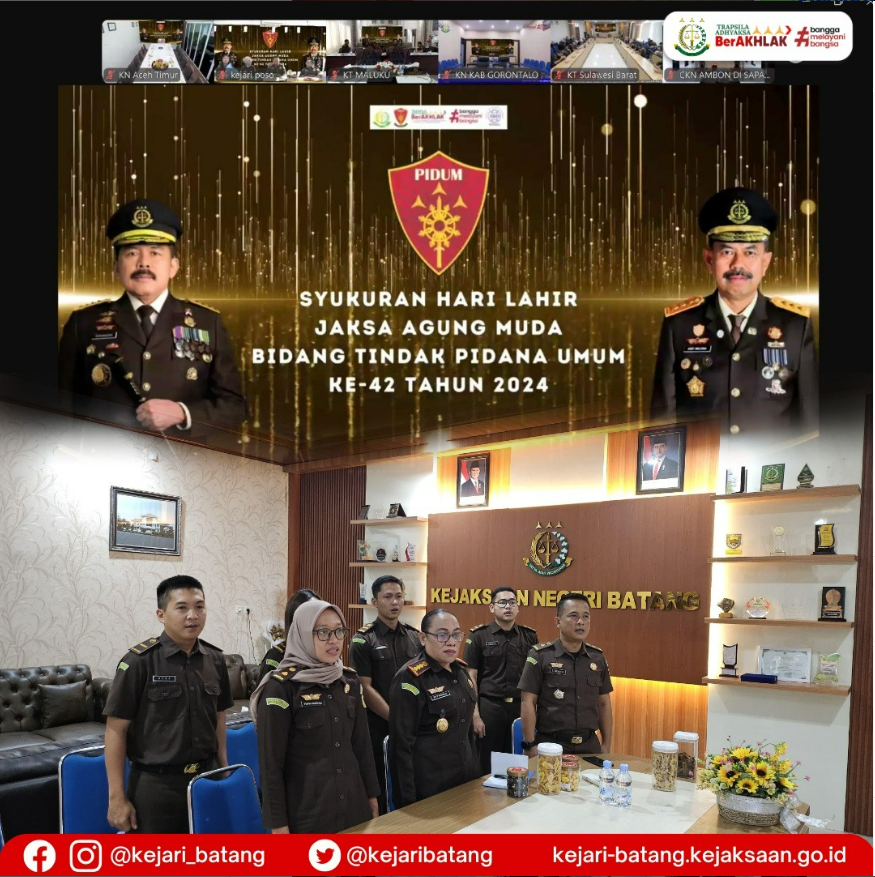 Bahwa pada Hari Selasa, 7 Januari 2025 bertempat di Kejaksaan Negeri Batang, Kepala Kejaksaan Negeri Batang Dr. Efi Paulin Numberi, S.H., M.H. beserta staff telah mengikuti vicon Syukuran Hari Lahir Jaksa Agung Muda Bidang Tindak Pidana Umum Ke-42 Tahun 2024.