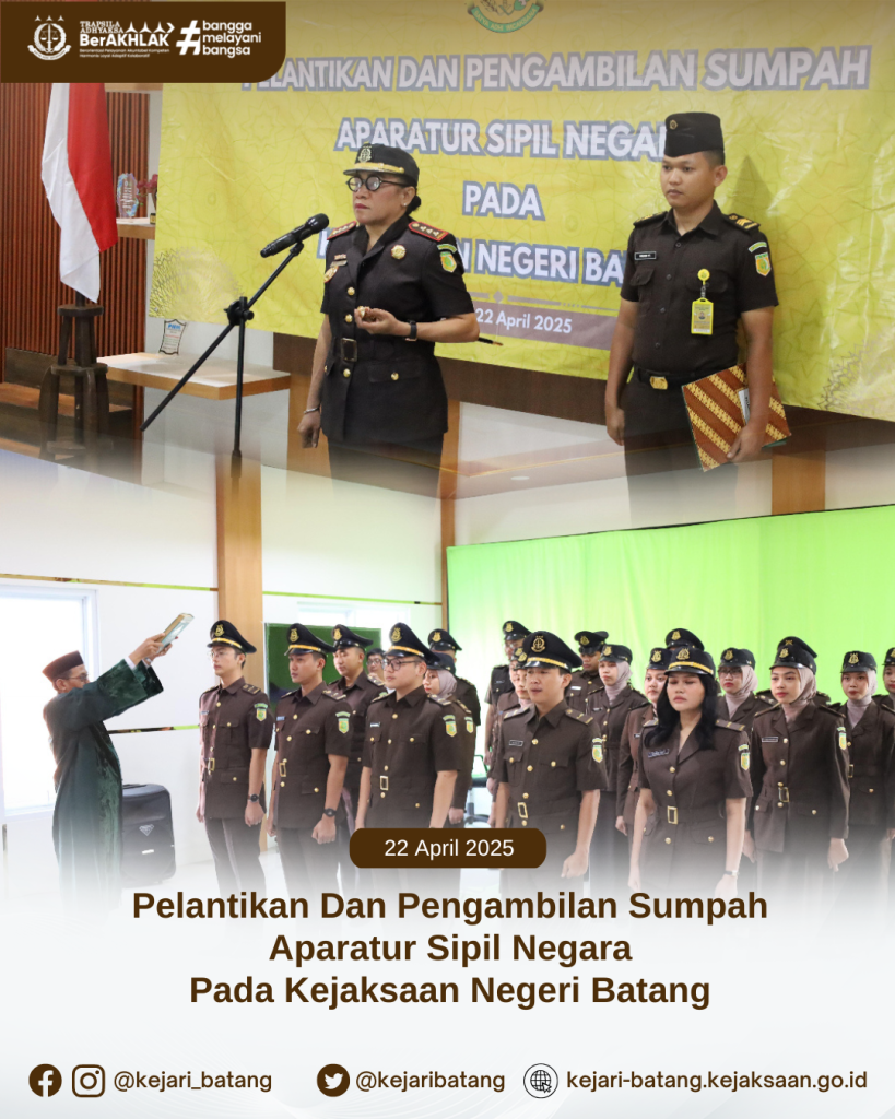 Bahwa pada hari Selasa, 22 April 2025 bertempat di Aula Kejaksaan Negeri Batang telah dilaksanakan Upacara Pelantikan dan Pengambilan Sumpah Calon Pegawai Negeri Sipil (CPNS) menjadi Pegawai Negeri Sipil (PNS) di lingkungan Kejaksaan Negeri Batang.