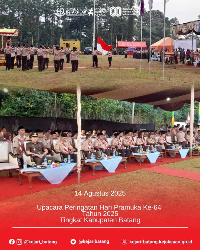 Batang – Pada hari Kamis, 14 Agustus 2025, Kepala Subseksi II Intelijen Kejaksaan Negeri Batang, Muhammad Saiful Tsani, S.H., M.H., telah menghadiri Undangan Upacara Peringatan Hari Pramuka ke-64 Tingkat Kabupaten Batang yang dilaksanakan di Bumi Perkemahan Pramuka Abirawa.
