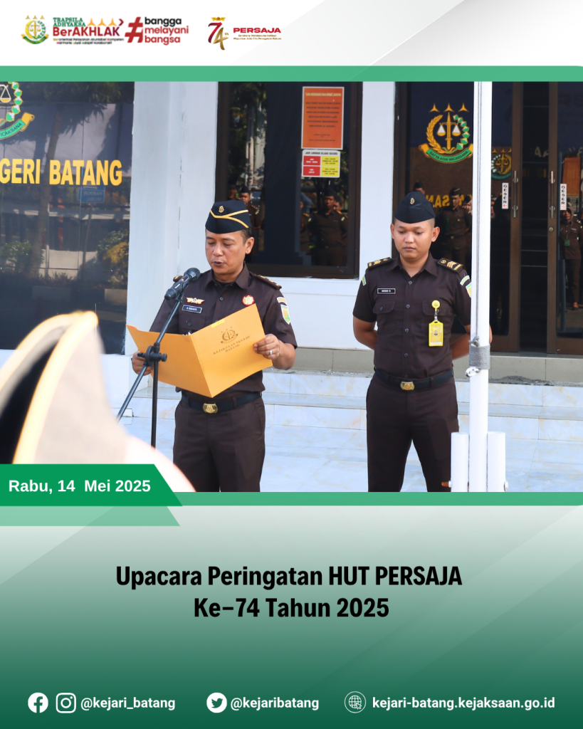 Rabu, 14 Mei 2025 bertempat di Kejaksaan Negeri Batang, Dalam semangat kebersamaan dan dedikasi, telah dilaksanakan Upacara Peringatan HUT PERSAJA Ke-74 Tahun 2025.